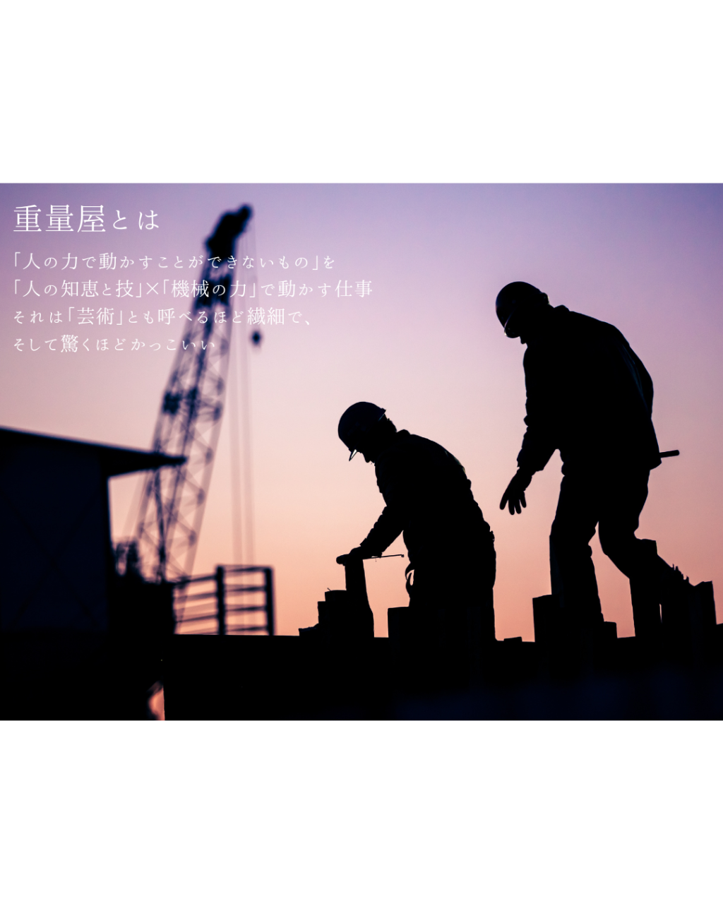 私たちは、専門性の高い重量物の運搬、据付、移設、解体工事を行うプロフェッショナル集団です。これらの業務を通じて、皆様の生活や社会インフラを日々支えており、見えないところで重要な役割を果たしています。